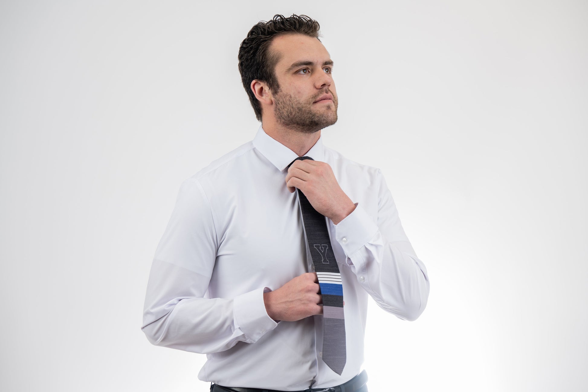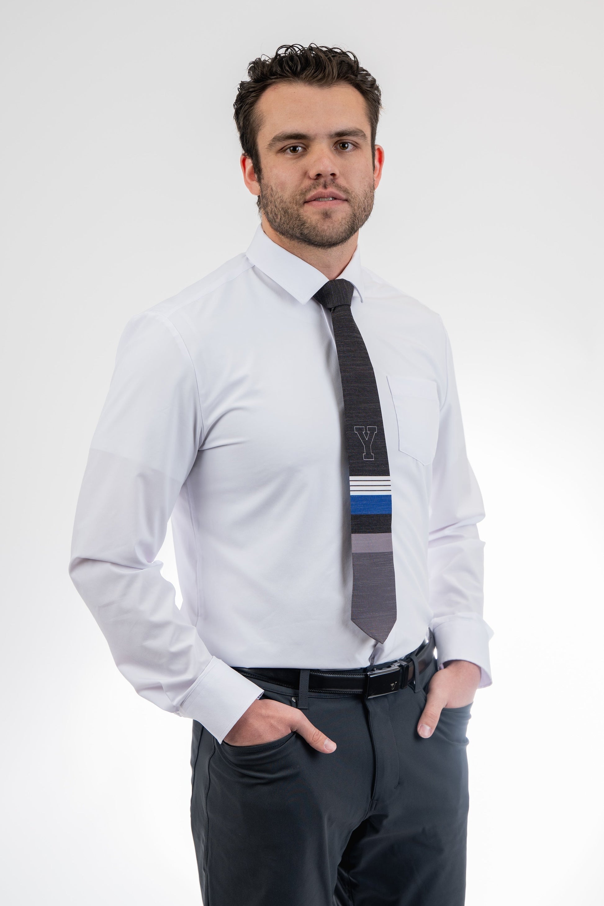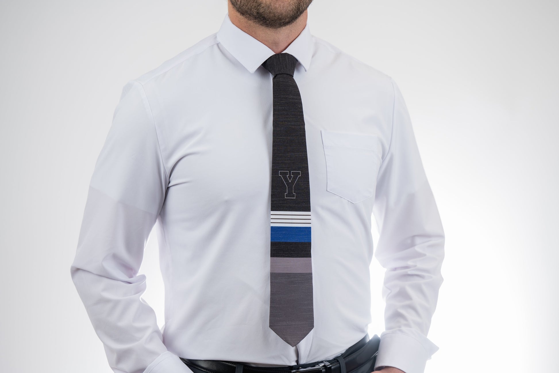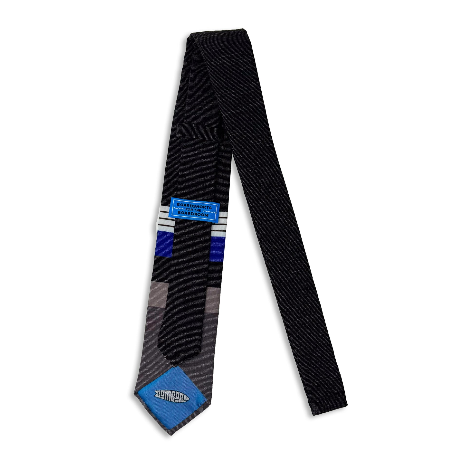 Show off your favorite team in a sharp, subtle, and stylish way with the 70s sunset BYU tie. Bombora's bestselling, fun, unique tie made of boardshort material, in BYU blue, black, and white stripes with the BYU logo.