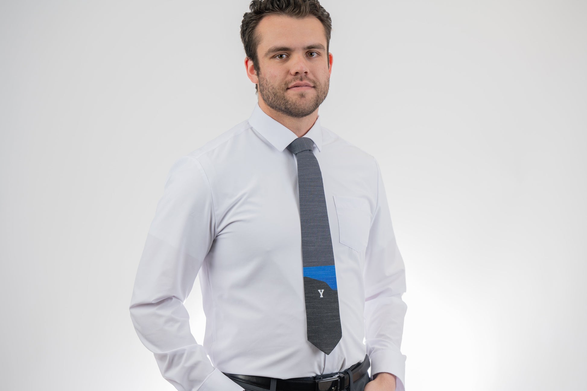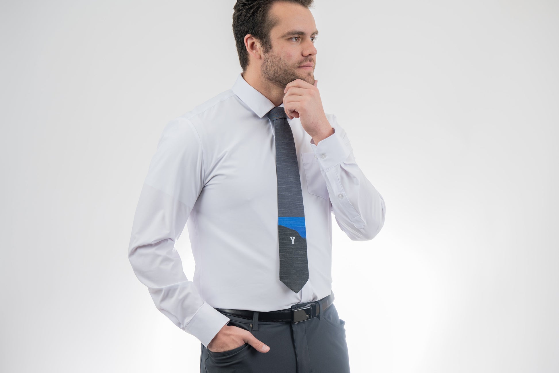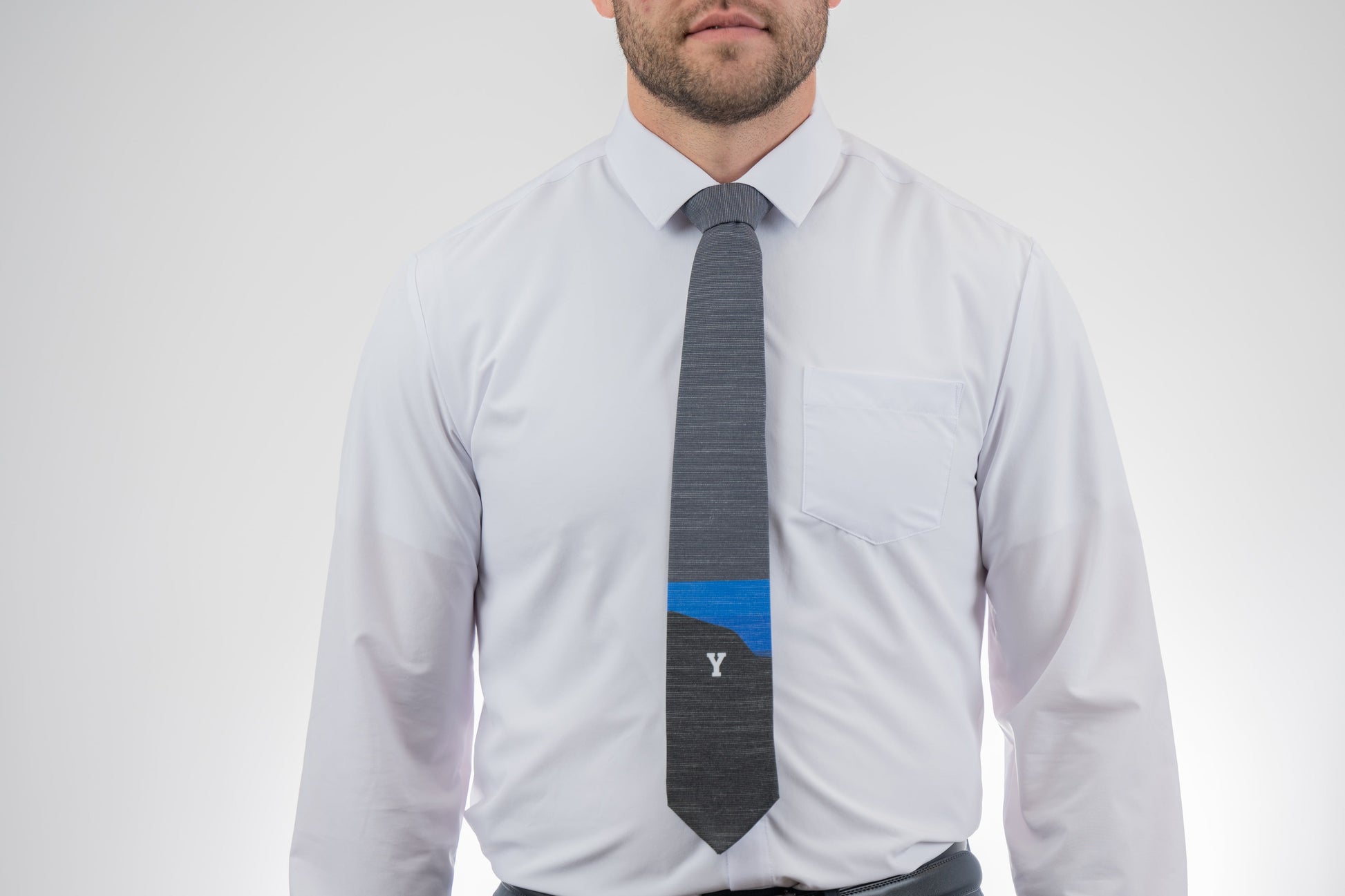 Now you don’t have to break a sweat hiking the Y to show your loyalty to the Cougars! Show off your favorite team in a sharp, subtle, and stylish way with the Y Mountain BYU tie. Bombora's bestselling, fun, unique tie made of boardshort material, in a colorblock BYU-blue, black, and white stripes and the BYU "Y" logo.