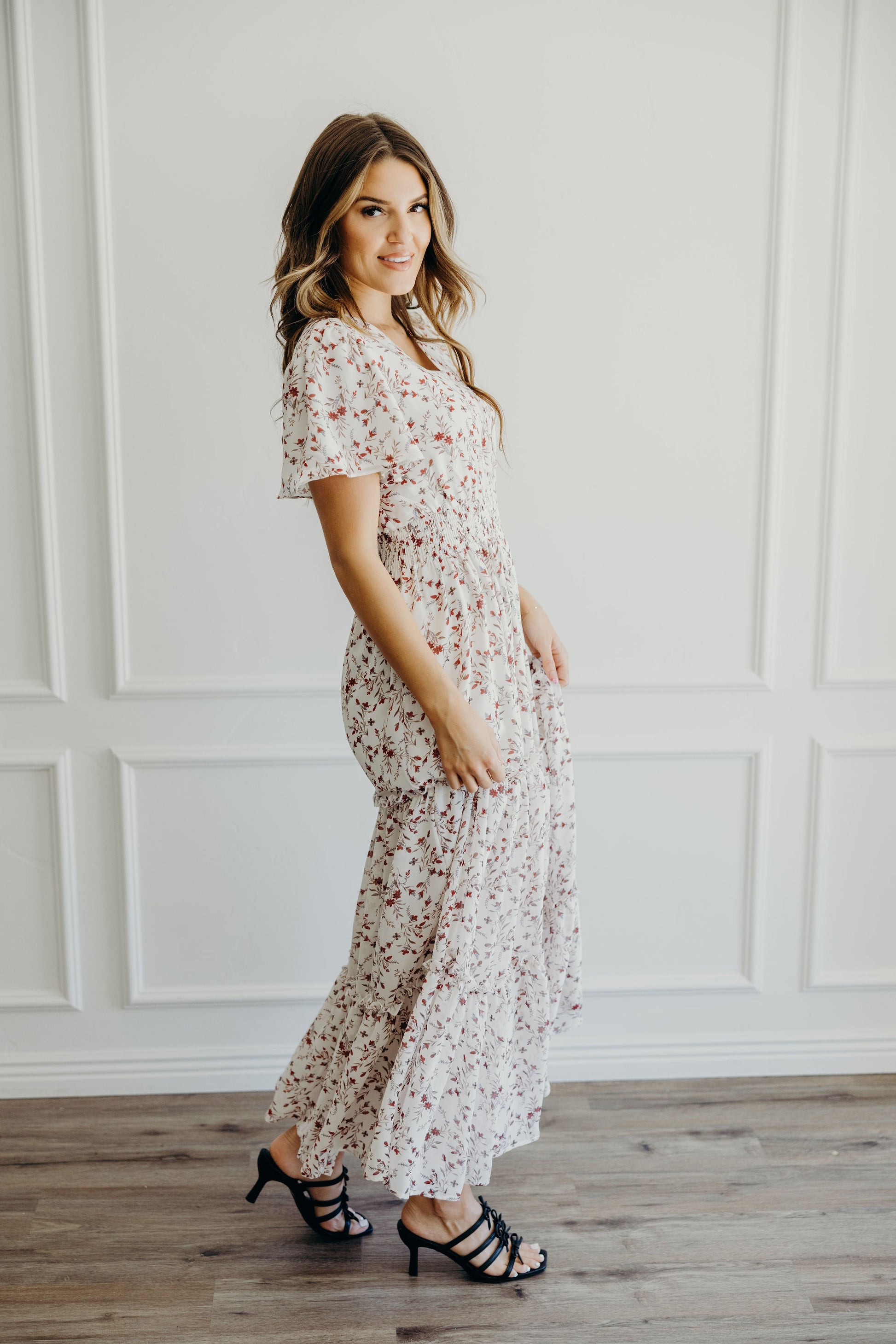 Maxi length dress, ruffle sleeve with elastic waist, and tiered skirt.