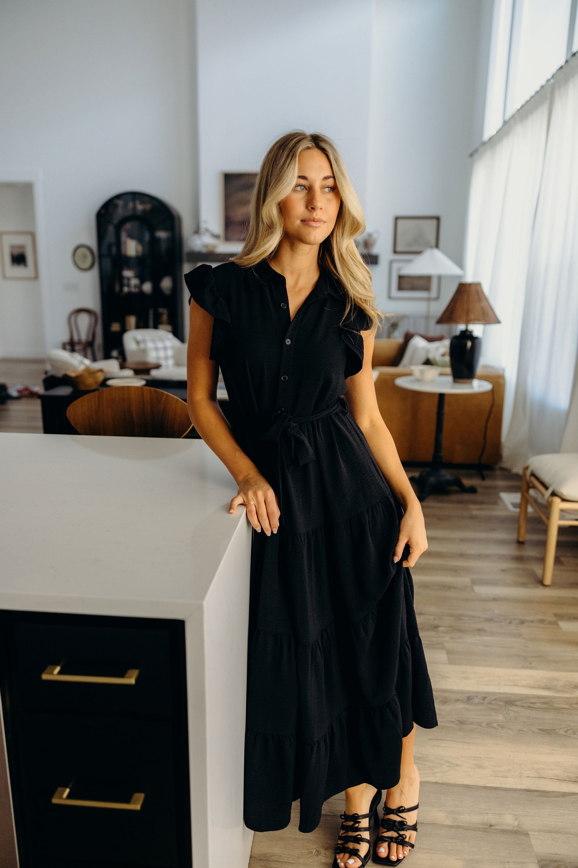 Maxi length dress with tiered skirt, natural waist with tie detail, button detail with ruffle sleeve.