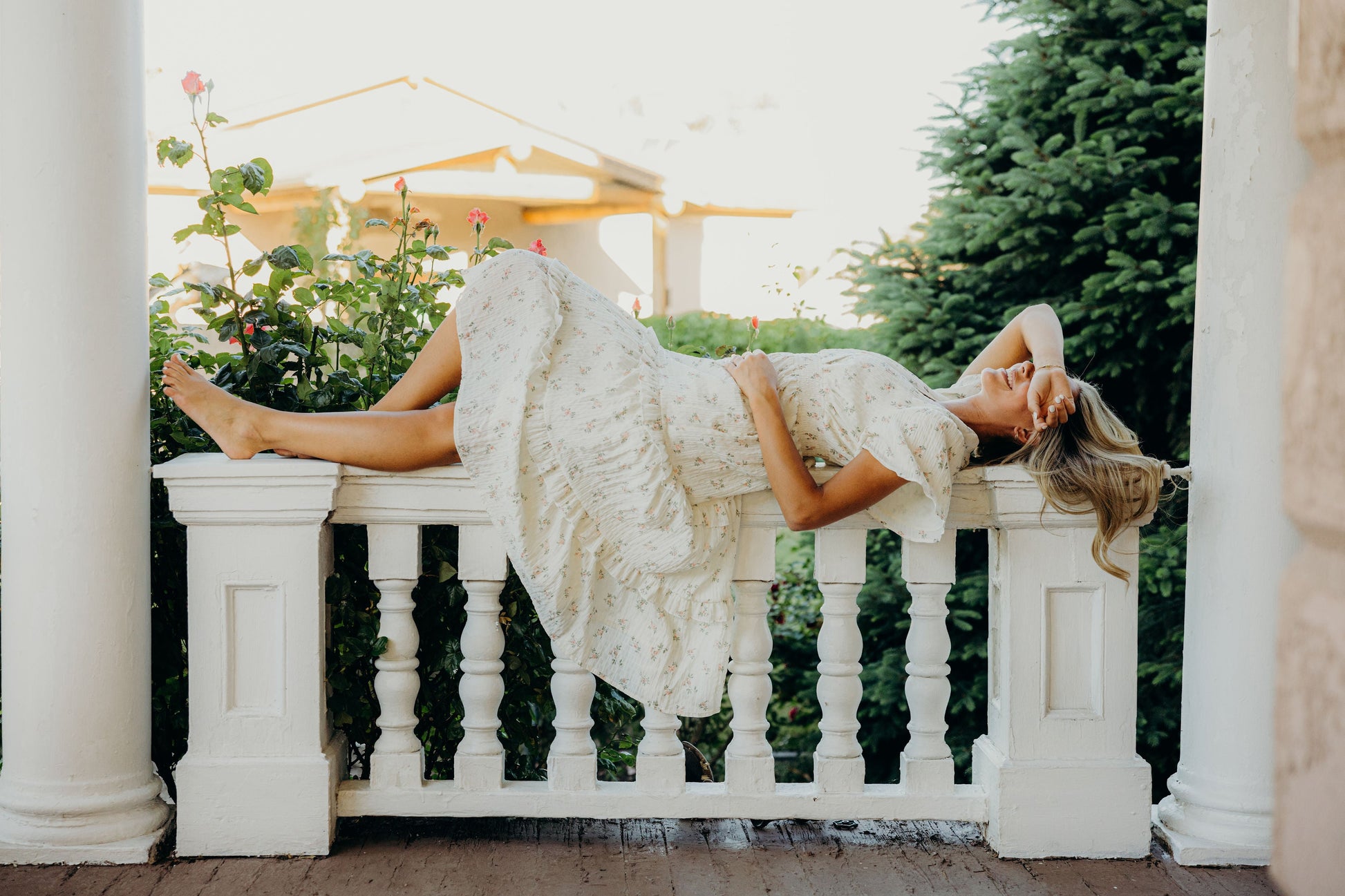 Midi length dress with natural waist, tiered skirt, v neckline, flutter sleeve and faux wrap detail.