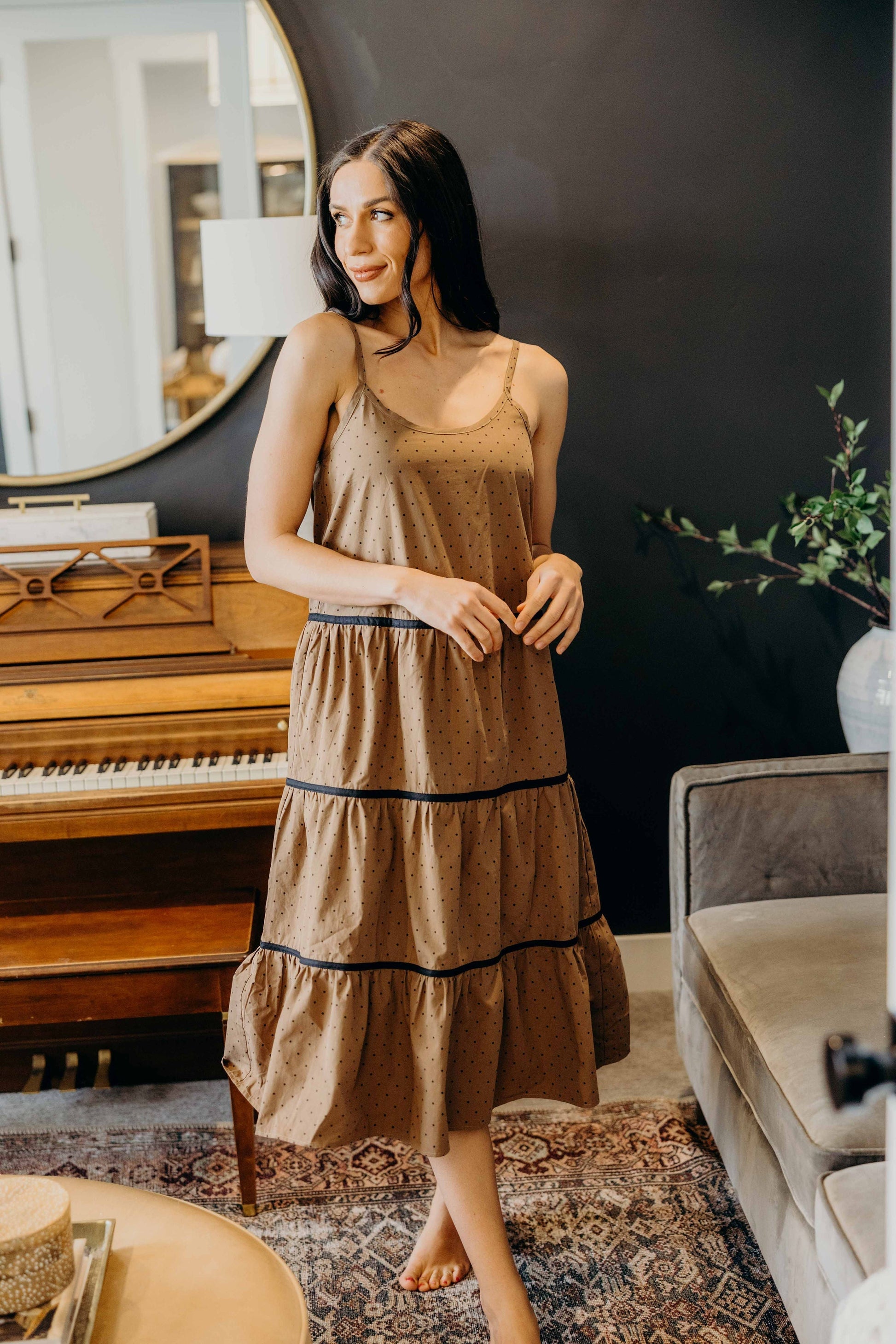 Tank top dress with round neckline, natural waistline, and tiered skirt.