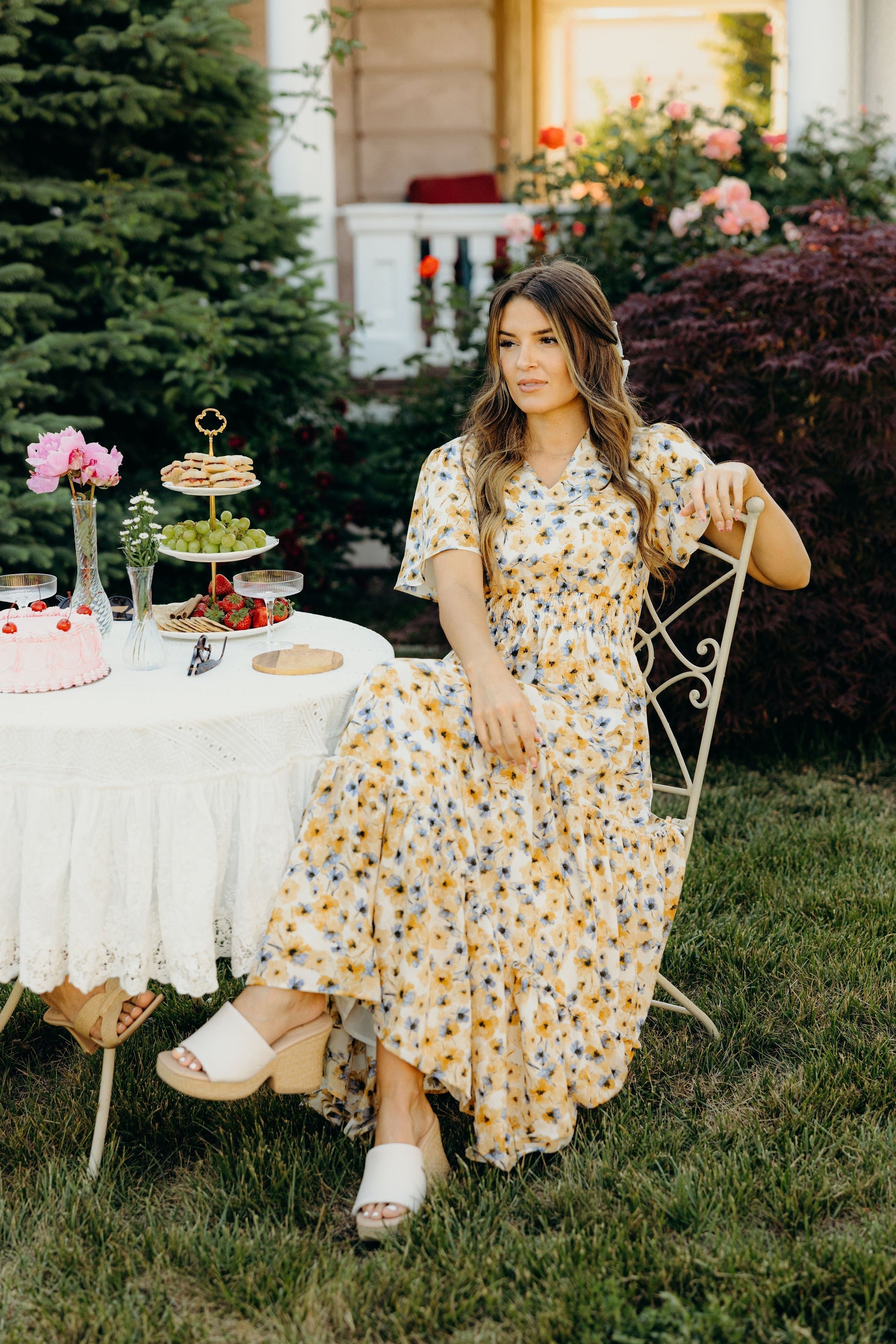 Maxi length dress, ruffle sleeve with elastic waist, and tiered skirt.